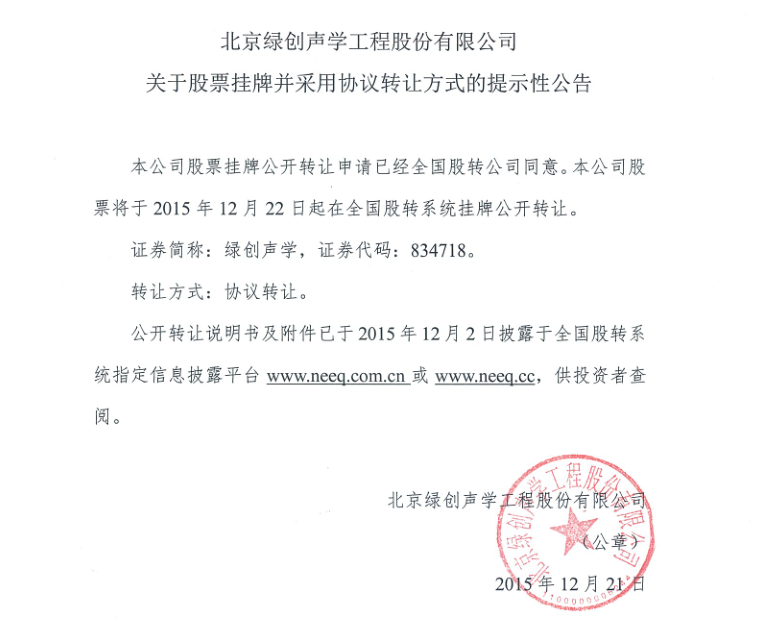 附:绿创声学挂牌公告